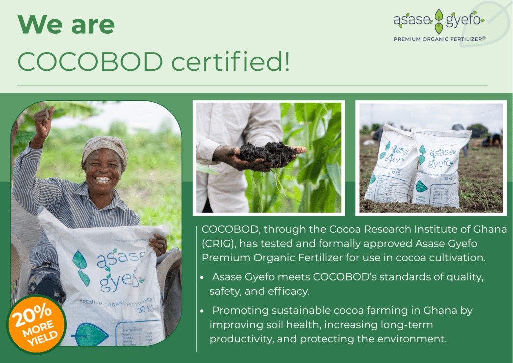 We are proud to announce that Asase Gyefo Premium Organic Fertilizer has been officially certified by COCOBOD!